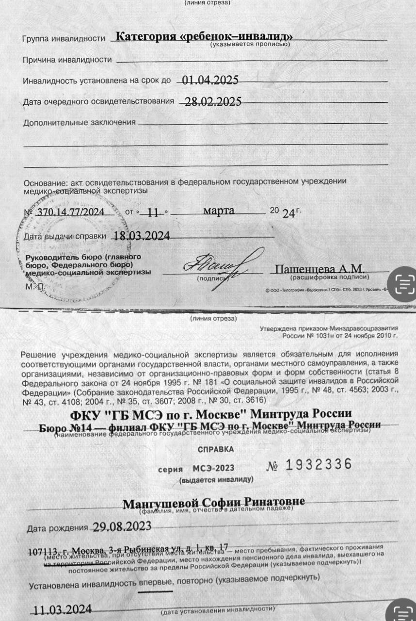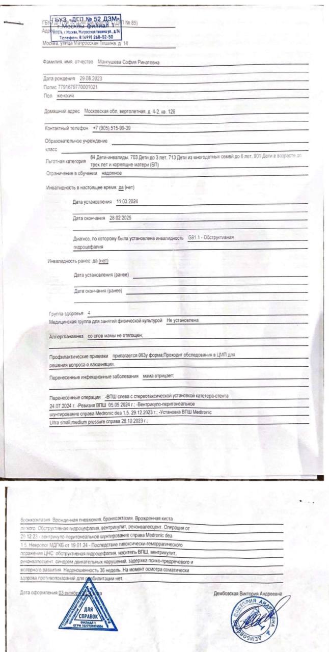 Здравствуйте🙏🏻!я многодетная мама ,воспитывающая 3 детей в одиночку🥺,самая маленькая дочь имеет диагнозы-гидроцефалия,ДЦП😖💔. Родилась недоношенной на 36 неделе😭,путем экстренного кесарева сечения.Сразу после родов попала в реанимацию❤️🩹🥺,где пролежала полтора месяца под ивл😢‼️,врачи буквально с того света ее вытащили⚠️.. После реанимации,пролежала в больнице,откуда вышла,когда ей было почти 5 месяцев.. у нее было 9 операций, в голове стоит уже 3 по счету шунт,предыдущие не приживались.Ей полтора года,она полностью лежачая,даже голову не держит,не умеет жевать и плохо глотает,постоянно поперхивается ,когда кушает,из-за этого она ест только жидкую еду(даю детское пюре в баночках).Она нуждается в постоянной реабилитации.. Вот ее диагнозы: