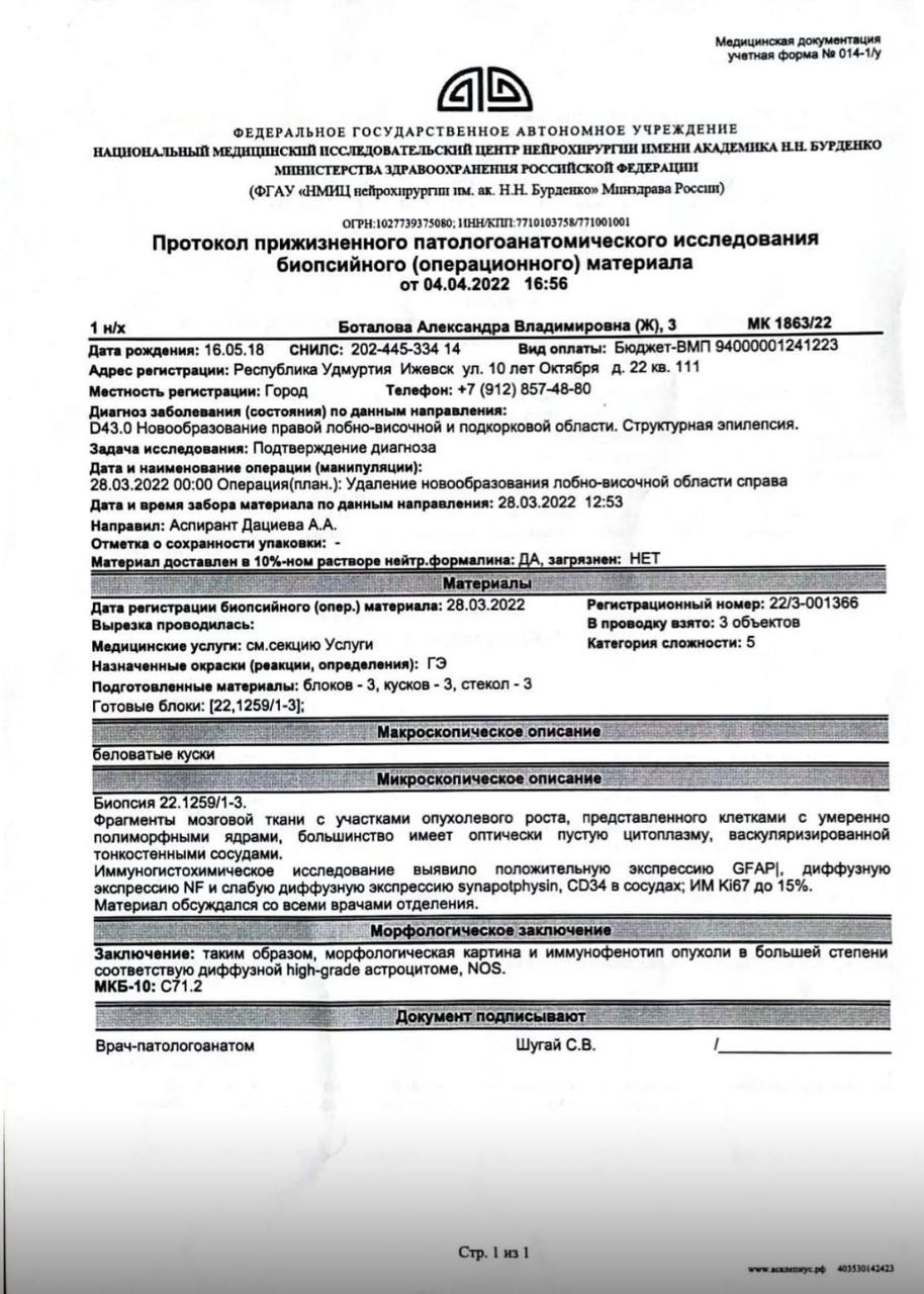 🧠 Диффузная high-grade астроцитома правой височной доли.