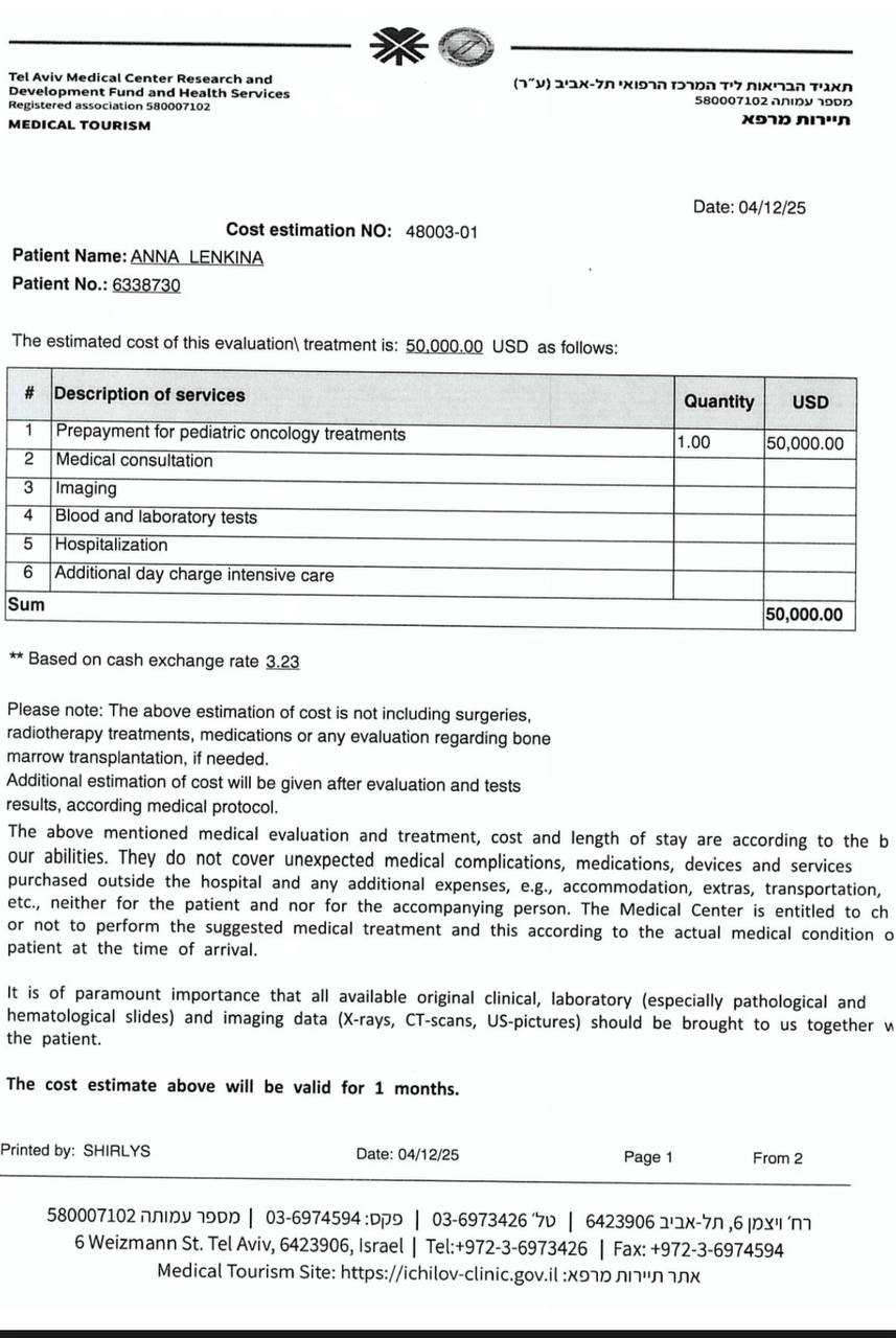 Ей нужно максимально точное и сильное лечение. Такое лечение возможно только за границей — в клинике в Израиле 💔