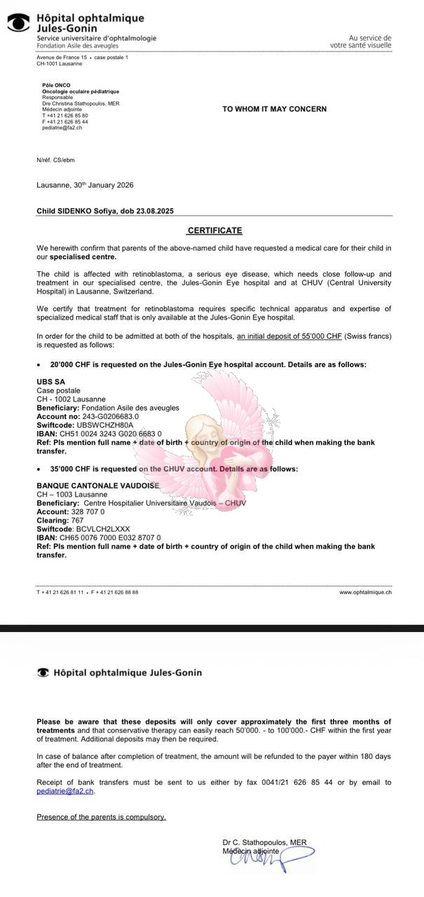 Чтобы остановить болезнь, Софии необходимо лечение в специализированной клинике Hospital Ophtalmique Jules-Gonin в Швейцарии. Там работают врачи, которые занимаются именно такими случаями и стараются сохранить детям глаза и зрение.
