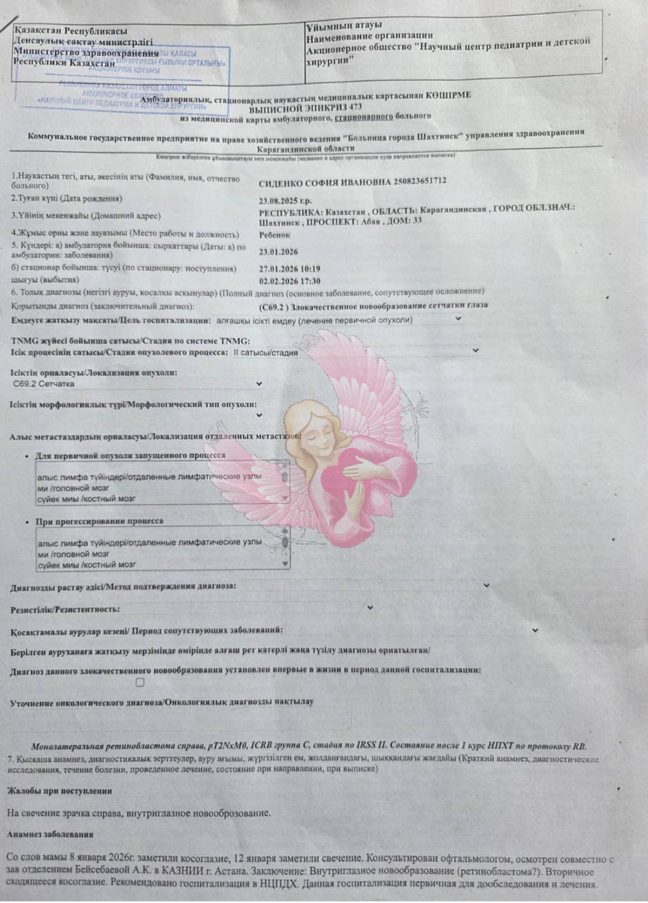 В Казахстане нам предлагают удалить глаз и на этом закончить лечение. Но в швейцарской клинике готовы бороться за зрение нашей девочки — у Софии ранняя стадия, и есть возможность сохранить глаз.