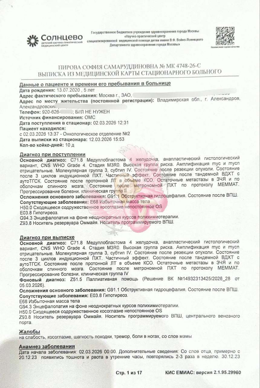 У Софии медуллобластома 4 желудочка, анапластический вариант — агрессивная опухоль головного мозга 💔🧠