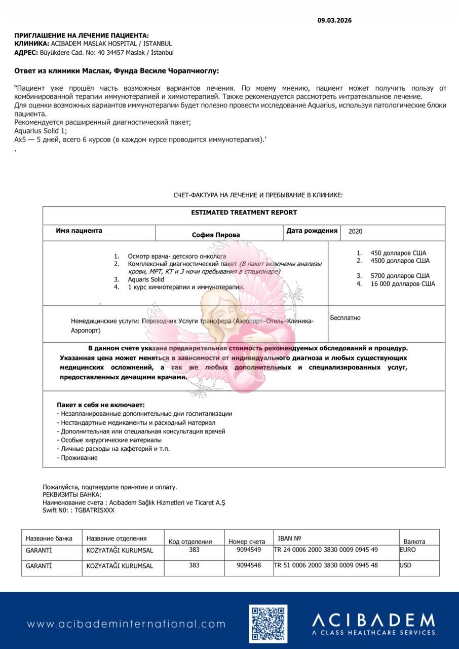 Врачи сказали, что Софии необходимо продолжить лечение в специализированной клинике ACIBADEM MASLAK HOSPITAL 🙏