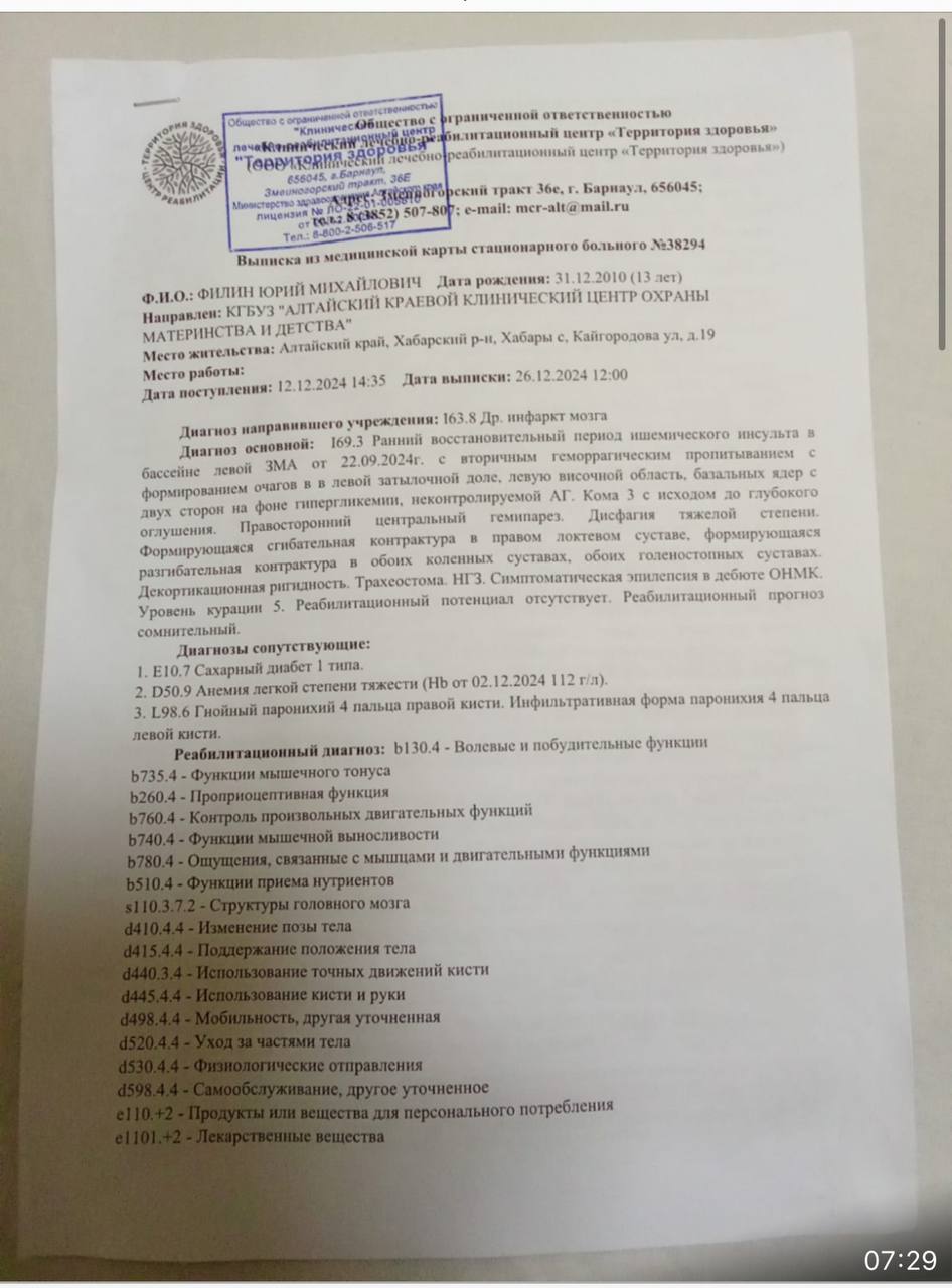 Здравствуйте. Мой юный 14 летний сын может погибнуть с минуты на минуту. В его юном возрасте случилось нечто страшное - это инфаркт мозга. В 2024г резко ухудшилось состояние сына, давление высокое, сахар 20. Нас определили в местный стационар, к вечеру самочувствие ухудшилось, его ввели в медикаментозную кому. На утро нас на вертолете доставили в детскую краевую больницу в реанимацию, при попытке вывести из медикаментозной комы случился ишемический инсульт, была двухсторонняя пневмония.